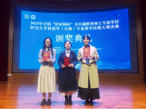 2024级学科教学(生物)专业硕士研究生在决赛中凭借扎实的专业功底、出色的教学设计和稳健的现场发挥脱颖而出。其中,蒙瑶臻同学斩获全国二等奖,肖心贤、王妍同学分别荣获全国三等奖。